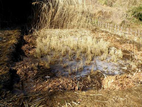 上の田圃 上の田圃には30〜40袋でしたか、置いてあった袋から落葉を出して、田圃に移しました。 本当は、田圃に入って、鍬で攪乱しておくべきだと思いますが、袋から出すだけで済ませて、萌芽更新地区に移動しました。