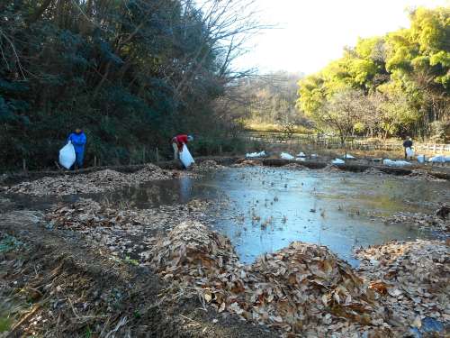 | 田圃に落葉を入れて、萌芽更新地区の伐倒した樹木を伐り直す活動