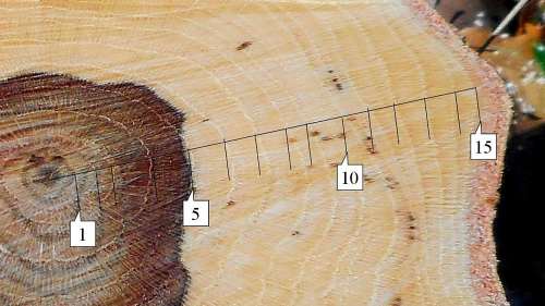 少し下で伐倒したコナラは、細く見えましたが、年輪からは15齢であったと推測されます。