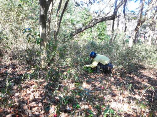 野鳥の森、科学館裏谷戸のアオキ実生の抜き取り 日時 2017/3/9(木) 10:00〜13:00 晴 場所 生田緑地 野鳥の森、青少年科学館裏谷戸 参加者 岩田芳美、細川洋子 野鳥の森の園路沿いや、県の木見本園に生えてきたアオキの実生を抜き取る活動を行いました。 野鳥の森では、夏季に園路沿いのアオキ、シュロ、ヤツデの抜き取りを実施しましたが、時間の関係で途中で終わりました。 そこで、この日は残りのアオキ、ヤツデを抜き取りました。 猛禽類に襲われたのでしょうか? 2ヶ所に、野鳥の羽根が散乱していました。