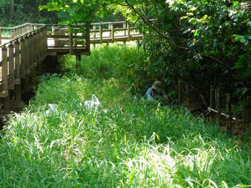 セリバヒエンソウ駆除 里山倶楽部Aの活動でも行った、隣地の竹林と木道の間の草地のセリバヒエンソウ駆除の続きも行いました。 また、上の田圃下の草地に蔓延ったセリバヒエンソウの抜き取りも行いました。 上の田圃下の草地は明るいため、カナムグラも成長していましたので、周りの草に絡んで大きくなっていたカナムグラを引き抜きながら、活動しました。 アカサシガメと思われるカメムシがいました。 それから、イネ科植物が広範囲に繁茂して開花しており、活動中、花粉が舞い上がって、視界が悪くなるぐらいでした。 この日も、大学時代の友人Sが来ていて、何気なく、「調べた方がいい」と言ってくれたのですが、イネ科植物は難しいからと答えて持ち帰りませんでした。 しかし、帰宅後、記憶を頼りにインターネット等で調べてみて、何となく、外来種のコヌカグサかも知れないと思いました。 やはり、植物班に頼んで調べてもらった方が良さそうです。 その上で、上の田圃下の草地の管理方法は見直した方が良いかも知れません。