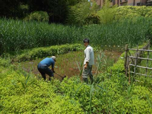 田圃の水漏れ補修、カナムグラ刈り 日時 2017/6/15(木) 10:00〜12:00 晴 場所 生田緑地 上の田圃&下の田圃地区 参加者 岩田芳美、鈴木潤三、田村成美 まず、田圃の水漏れ補修から行いました。