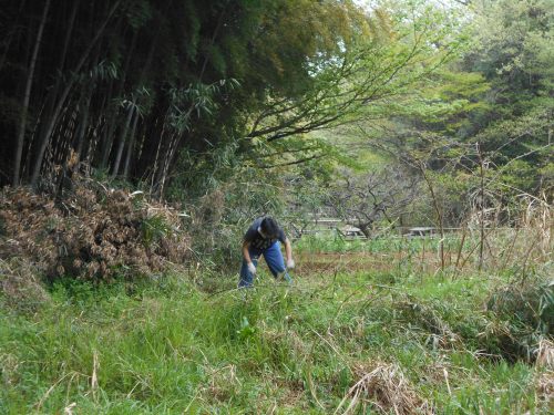湿地の保全管理 (水田ビオトープ班) 日時 2018/4/5(木) 10:00〜12:30 曇 場所 生田緑地 ハンノキ林下の湿地 参加者 岩田臣生、岩田芳美、鈴木潤三、田村成美 オギ・ヤマグワ・アズマネザサの茂みの刈り取り(鈴木、田村) ハンノキ林下の湿地のオギ、ヤマグワ、ヒメコウゾ、アズマネザサが混生するヤブを刈り払いました。 4月初めの活動で刈るようになってから 10 年経過しています。 毎年刈っているのに、ヤマグワ・ヒメコウゾは 3mを超えるものもあります。 冬の間、アオジなどが利用している場面を観察しているので、茂みを残していることは正解だったと思います。