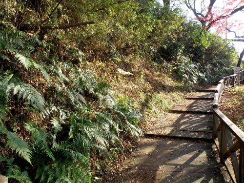ピクニック広場東側の階段の山側斜面については、ハンショウヅルの花を観察できる場所として、ハンショウヅルを刈らずにアズマネザサだけを刈る面倒な管理を行っています。 斜面であるためにタマノカンアオイなど丈の低い植物の観察も容易です。 今年の気候は異常で、ハンショウヅルが既に新葉を展げていました。