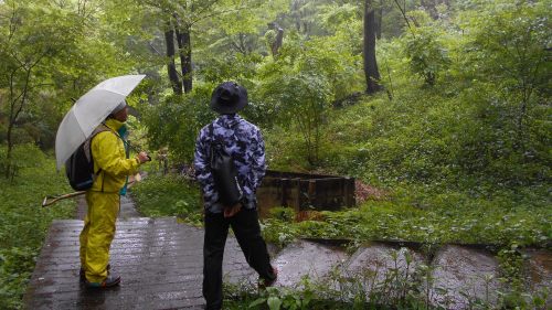 上の田圃の導水路の水漏れ補修、入団希望者への活動説明 日時 2019/5/14(火) 9:30〜11:30 雨 場所 生田緑地 谷戸 参加者 岩田臣生、岩田芳美、宗像恵太 5/12(日)の生田緑地観察会の時に、上の田圃の導水路に大きな穴が開いていて、田圃の水が完全に涸れていたため、足で踏み潰して、水漏れを止めたのですが、 そんな方法で本当に止まっているのかどうか不安でしたので、補修し直すことにしました。 天気は雨になったので、普段なら、次回のことにして休むのですが、水田ビオトープ班への入団希望者があり、活動説明を予定していましたので、出かけました。 水田ビオトープ班の活動のメイン・フィールドである谷戸を上から下まで案内して、活動の説明をしました。