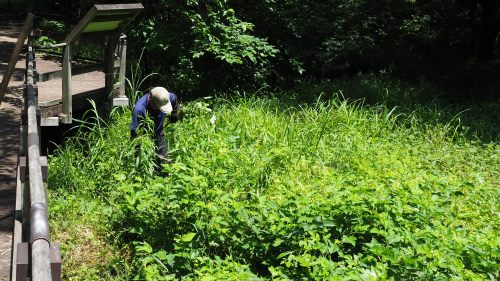 ヨシ刈り 日時 2019/5/30(木) 10:00〜12:00 晴 場所 生田緑地 上の田圃地区、下の田圃地区 参加者 鈴木潤三、田村成美 上の田圃の上の草地、下の田圃地区の木道沿いのヨシやカナムグラを刈りました。