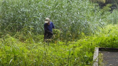 下の田圃地区の木道沿いのカナムグラ刈りも行いました。