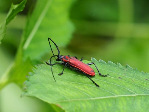 また、カナムグラを剥がした下にあったツリフネソウの葉上に、ベニカミキリがいました。 ヒメギスも見つかりましたが、素早く逃げてしまいました。 久し振りに雨が降らず、気温が上昇したせいか、あちこちの葉上には、イオウイロハシリグモが体を伸ばしていました。