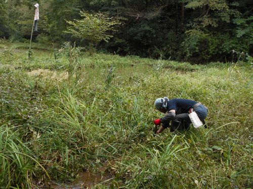 谷戸の水辺保全、カナムグラ刈りなど 日時 2019/10/15(火) 10:20〜13:30 場所 生田緑地 ハンノキ林地区、湿地地区、上の田圃地区、下の田圃地区 参加者 岩田臣生、岩田芳美 ハンノキ林地区 ハンノキ林上の池からの水流が復活して、勢いよく流れていましたので、その流れを見ながら、10/10(木)に保全活動を行った水辺のうち、 地区右岸の水流について、水溜まりと流れを確認しながら、落枝と泥を追加して、水溜まりのダムをつくっていきました。 水辺の湿地にはキチジョウソウが咲き始めていました。