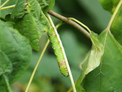 近くの萎れたクサギにシモフリスズメ幼虫がいました。 シモフリスズメは、蛹で越冬します。
