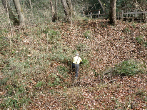 A南東端部では、アズマネザサ刈りを行いました。 この辺り(標高)は、湧水が滲み出してくる場所で、大型のスゲ植物であるミヤマシラスゲの群落があります。