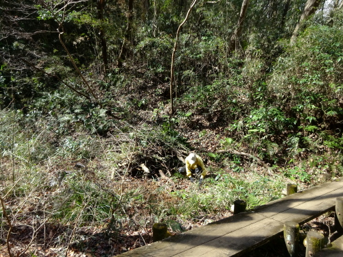城山下谷戸のアズマネザサ刈り、水辺利用を調査するための定点カメラ設置 日時 2020/3/5(木) 10:00〜12:00 曇、強風 場所 城山下谷戸地区 B11 参加者 岩田臣生、岩田芳美、鈴木潤三 城山下谷戸のヤマルリソウが咲き始めたので、アズマネザサを刈っておくことにしました。 アブラチャンの蕾も黄色みを増して、開花も間近のようです。 林床のアブラチャン実生は、数は多いながら、細くて小さく、なかなか大きくなりません。