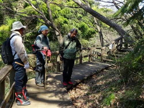 ヨシ刈り 日時 2020/3/26(木) 10:00〜13:00 晴 場所 生田緑地ヨシ原地区 B08 参加者 岩田臣生、岩田芳美、北川英樹、鈴木潤三、田村成美 谷戸の末端のヨシ原地区(B08)の植生管理活動を始めたのは 2007 年 2月でした。 当時、生田緑地を管理していた北部公園事務所に対して、隣接町会から、枯れたヨシなどが危険なので刈って欲しいという要望が出されたことから、 水田ビオトープ班と北部公園事務所とで話し合い、水田ビオトープ班が当該地区の自然を調査し、管理することにしました。 ヨシ刈りの時期については、当初 11 月に行っていたのですが、冬鳥が隠れる場所が欲しいので、春まで刈らずにおいてほしいという野鳥班からの要望を受けて、ヨシ刈りは春の行事にしました。 刈ったヨシは谷壁斜面側の目立たない場所に積んでいたのですが、なかなか腐朽することなく、次第に高くなってしまいました。 そこで、今回は、刈り取って積むのは止めて、できるだけ短く切り刻んで、辺りに撒き散らすことにしました。 土地は、長靴がズブズブ潜る湿地が大半なので、足場を確保する意味でも足元にあった方が動き易くて良いのです。 植生管理計画としては、ヨシ原としているので、撒き散らすことに問題はないと思います。 実際、ヨシが密生する中に生育してきた植物は、カラスウリ、フジ、クズなどでした。 南側には、カサスゲが生育し、一時期、ヒメシロネも見られましたが、高茎植物が繁茂してしまうと、ヒメシロネは負けてしまいます。 今回は、水田ビオトープ班としての活動は初めてのメンバーも加えて 5 人で、ヨシの茂みを刈ることにしました。 谷戸に降りて、現地に向かう途中、野鳥班の平賀さんに出会い、情報交換を行いました。