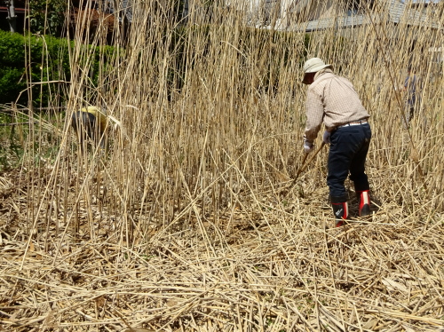今まで、刈ったヨシを積んできた山を崩して、通路になっている所に広げる活動も始めたのですが、下の方まで腐っておらず、ヨシ刈りを優先すべきと考えて、途中ながら止めました。