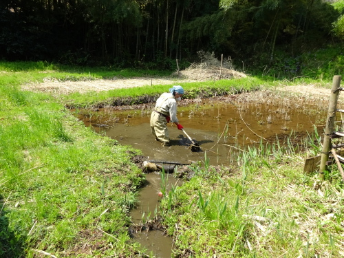 代掻き、セリバヒエンソウ駆除 日時 2020/4/16(木) 10:00〜12:30 晴 場所 生田緑地 参加者 岩田臣生、岩田芳美、鈴木潤三、田村成美 コロナ対策として外出自粛が要請されていますが、上の田圃、下の田圃の代掻きを済ませておきたいと思いました。 また、セリバヒエンソウが早くも咲き誇ってきましたので、駆除も行いました。 平日ですが、近くの園路を通る来園者が多く、マスクを着用していないのに、声をかけてくるので困りました。 〇下の田圃の代掻きを行いました。 下の田圃の(アズマヒキガエルの)オタマジャクシや、ホトケドジョウの稚魚は、雨で流されてしまったかと心配していましたが、元気に泳いでいました。 代掻きとは言いながら、行動としては、発芽していたミゾソバ、ヨシ、そして投入したままになっていた落葉、昨年の稲株などを泥の中に鋤き込むように攪乱しました。 湿田は深くて、一歩移動するのも大変です。 この田圃は 2004 年に再生したものですが、その頃、できたばかりの田圃の中で、パトロール中のオオスズメバチと対峙した時のことを思い出しました。 周辺では、テングチョウ、キアゲハ、ツマキチョウが飛んでいました。 代掻きを終えて、木道に腰をかけて休んでいたら、ヤトセスジジョウカイが飛んで来て、木道端に止まりました。 殆んど飛び続けているツマキチョウが、近くのミヤマシラスゲの葉、ノイバラの先端に止まってくれました。
