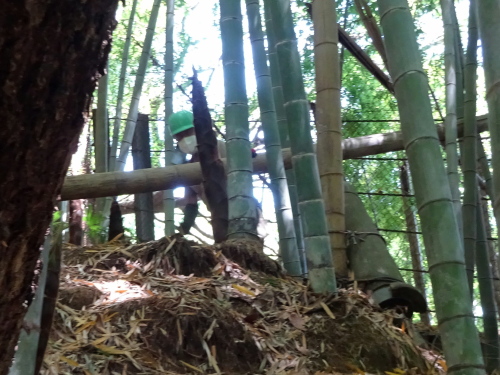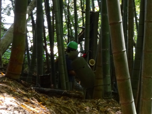 この皆伐更新の活動は、自然に発芽した実生をアズマネザサなどから守って育てるという根気強い戦いになり、しかも、それが 7 年はかかるだろうと考えられました。 そこで、子どもたちとそのお母さんを中心にした里山倶楽部Aという仕組み(チーム)を新設して、毎月活動してきました。 毎月、この場所で活動していたので、この地区の周囲に侵出していたモウソウチクが気になっていました。 しかし、モウソウチクは太くて重く、しかも斜面は急勾配でしたので、手軽に除伐できるものではありません。 都市公園のレクリエーションとしての里山倶楽部の活動としては、重すぎる活動だと思いました。 それでも、2014年11月15日の里山倶楽部において、第一回のモウソウチクの除伐を行い、その後も毎年継続しています。 今年も、4月19日(日)の第 2 回里山倶楽部で実施しました。 その際にも、見つけたタケノコは全て除伐しました。 しかし、2 週間以上が経過した今回は、見落としていたものや、その後出てきたものなどが大きく育っていました。 竹になって枝葉を広げたモウソウチクを除伐するよりも、高さ 7〜8mに育っていても、竹になる前の方が、除伐ははるかに楽です。 そこで今回は、タケノコを伐倒する活動を行いました。 アズマネザサが繁茂していたため、アズマネザサ刈りをしながらの除伐となった場所もありました。 多分、60〜70 本を伐倒することができたと思いますので、竹の除伐に比べて、コスト・ベネフィットは良かったと思います。 野鳥の繁殖期ではありますが、伐倒したタケノコが倒れる音はあったものの、3〜4人の機械を使わない半日の活動ですから、大きなダメージにはならないでしょう。 キビタキの麗しい声が響いていました。