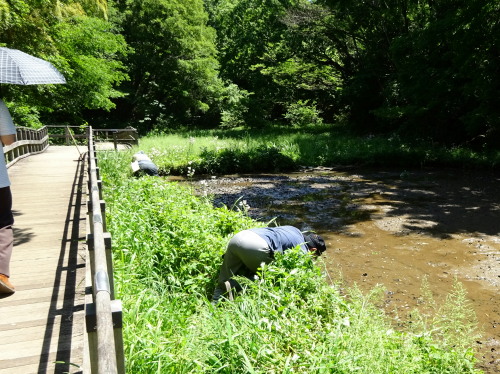 田圃の泥上げ、セリバヒエンソウ駆除など 日時 2020/5/14(木) 10:00〜13:00 晴 場所 生田緑地 上の田圃〜下の田圃地区、ヨシ原地区 参加者 岩田臣生、岩田芳美、鈴木潤三、田村成美 上の田圃が水漏れを起こしていて、田圃下の池は涸れていました。 急いで、水漏れ穴を探り、水漏れ穴と思しき所に、イネワラを詰めて、塞いでいきました。 しかし、田圃に引いている水の流量が少ないためか、なかなか水面が広がってくれません。