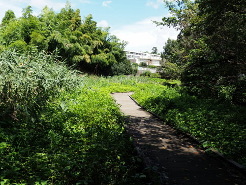 そこで、まず、田圃裏のヨシを刈りました。 それから、一度、木道に上がって、日陰で休みました。湿度が高いので、熱中症の危険があります。 幸い、弱い風が吹いていました。 辺りには、ツクツクボウシ、ミンミンゼミ、アブラゼミの蝉時雨が降り、時折、ガビチョウの声が混じりました。