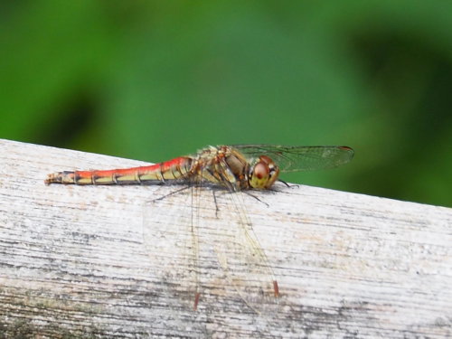 ハラビロカマキリが木道の手摺にいました。 ムネアカハラビロカマキリは前脚基部に多数の小さい突起、胸部が一様に紅いということを思い出しながら確認しなければならない面倒な状況になりました。