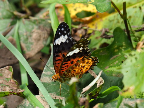 ツマグロヒョウモン(メス)が、田圃の畦のドクダミの葉上に飛んで来て、産卵行動をしているように見えました。