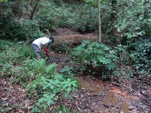 東側の斜面下の水流も、手入れを要する状態に見えましたが、冷たい小雨が降り出したので、この日の活動は終わりにしました。 また、湿地地区のツリフネソウが実の季節となったので、カナムグラ刈りを再開しました。 これは、カナムグラの種子散布を押さえるためです。 ツリフネソウの花を巡って飛び回っていたホウジャクの数は減って、この日はマルハナバチが目立っていました。 オオカマキリも活動していました。