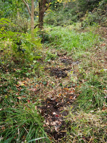 旧岡本谷戸、科学館裏谷戸の水辺保全など 日時:2020/11/24(火) 9:50〜14:00 場所 生田緑地 旧岡本谷戸、科学館裏谷戸、谷戸 参加者 岩田臣生 水田ビオトープ班では、生田緑地中央地区南側のエリアの水流、B01 野鳥の森の水流、B02 科学館裏谷戸の水流、B03 旧岡本谷戸の水流の 3 本について、年 1 回の泥上げを行っています。 野鳥の森の水流は、11/12(木) に行いました。 この日は、連休明けで青少年科学館などが休館で、天気も、時々霧雨が降ってくる曇空であったため、中央広場の来園者が少なかったので、旧岡本谷戸と科学館裏谷戸の 2 本の水流の保全活動を行いました。 旧岡本谷戸の水流に溜まった泥を掬い上げて、連続する水溜まりをつくる活動を行いましたが、染み出してくる水は極めて少なく、水流をつくりながらという保全活動にはなりませんでした。 湧水量が非常に少ないことはどうにもなりませんが、数日経ってからでも水溜まりができれば、水辺の生きものは何とか生き抜いてくれるでしょう。