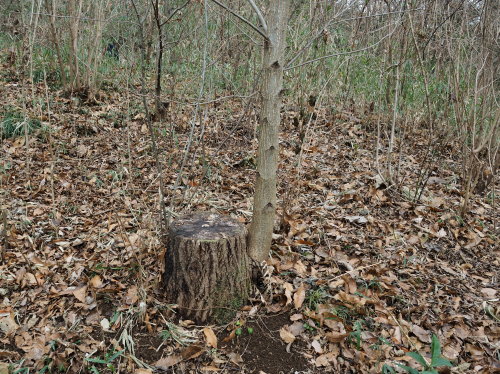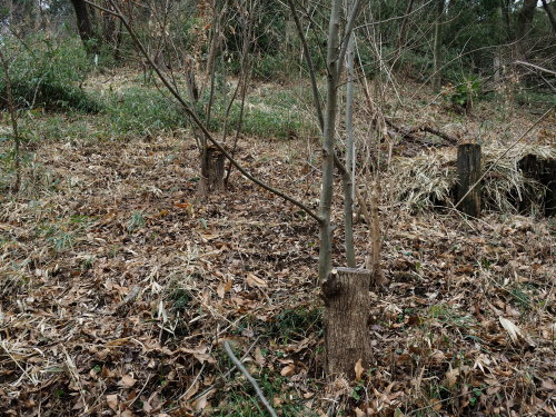 萌芽更新地区の萌芽更新管理など 日時:2021/1/26(火) 10:00〜14:00 場所 生田緑地 萌芽更新地区(A06) 参加者 岩田臣生 萌芽更新地区を萌芽更新地区と呼べる樹林にするために、2009年から、樹木の伐採やアズマネザサ刈りを繰り返してきました。 冬期ということもあって、伐り株から萌芽しているクヌギは元気なのですが、 低木層であるはずのムラサキシキブ、ヤブムラサキ、ゴンズイなどが大きく枝を広げているため、霞がかかったように隠されていました。 低木層が密集しているので、間伐することも考えましたが、その前に、ある程度、枝を刈りこんで、樹林としての状態を見てから、間伐が必要なのかを考えることにしました。 そこで、今回は、萌芽株から出ている萌芽枝のうち、特に細い萌芽枝や、混みあっていて、無い方が良いと思われる萌芽枝を伐り取る活動と、 低木層になる樹木について、樹高 2mを超えないように、また込み合っている枝を剪定する活動を行いました。 この活動中に、直径 10cmを超えていて、萌芽更新目的で伐採した方が良さそうなコナラがあることが分かりました。 また、アズマネザサ刈りの必要な場所も多々ありましたし、落葉層が厚いと思う場所もありましたので、活動が必要です。 次の写真の萌芽株は、2017年2月に伐採したクヌギです。
