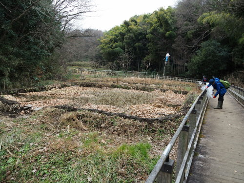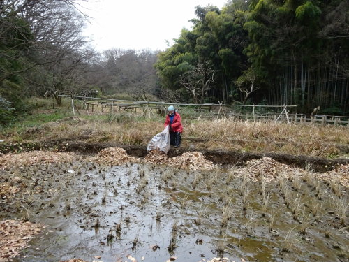 田圃に落葉投入、ハンノキ林のアズマネザサ刈り、落枝片付けなど 日時:2021/1/28(木) 10:00〜13:00 場所 生田緑地 ハンノキ林地区(A07)、田圃地区(B06、B07) 参加者 岩田臣生、岩田芳美、鈴木潤三、田村成美 谷戸の田圃の肥料は落葉だけです。 生田緑地に指定管理者制度が導入されてから、指定管理者が落葉を集めて、落葉プールなどに使っていましたので、その使い終わった落葉をもらって、田圃に入れていました。 今年は、新型コロナ感染対策として利用されることはありませんでしたが、集めた落葉をいただきました。 この日は、いただいた落葉を田圃に入れました。 勿論、田圃の中に広げなければなりませんが、それは後日、行うことにしました。