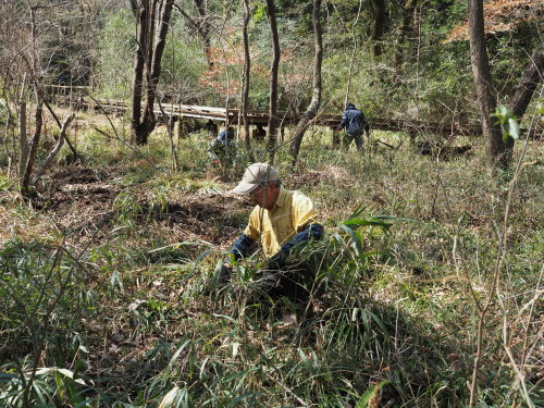 ハンノキ林のアズマネザサ刈りなど 日時:2021/3/11(木) 10:00〜13:00 場所 生田緑地 ハンノキ林(A07) 参加者 岩田臣生、岩田芳美、鈴木潤三、田村成美 ハンノキ林の植生管理については、高木層をハンノキが、草本層をミヤマシラスゲが優占し、湧水の流れが湿地を形成し、様々な水生生物が棲息するハンノキ林を目標植生としています。 ハンノキ林と林床の湿地を保全するために、流入する湧水を広げること、水流は渇水期にも水溜まりが残っているようにすること、この二つの活動を進めてきました。 ハンノキ林の樹林としての保全については、林内を明るくして、ハンノキの稚樹が育つ環境をつくる方向で活動してきました。 ただ、林内を明るくするためには、ある程度の高木の択伐が必要だと思うのですが、伐採してもよい高木の選択は難しくて、南端部のアカメガシワなどを除伐して以降、なかなか進んでいませんでした。 それが、ナラ枯れが始まったことで、ハンノキ林に入る光は増えて、林内が少し明るくなりました。 周囲の大きな樹木を減らすことは、考えてはいたものの、実行できませんでした。 ハンノキ林では、このナラ枯れを好機と捉えて、周囲の樹林の隣接域の手入れを行うことも課題になると思います。 林床のアズマネザサは昔に比べれば弱っていますが、明るくなることで、元気になってしまう可能性もあります。 ハンノキ林上の池に染み出す湧水は非常に少なくなっていて、何故か澄んでいません。 繁殖のために集まっていたアズマヒキガエルは、卵塊を残して引き上げました。 林内を流れる水流は流れを感じさせるだけの流量がありませんが、林床のかなりの部分は湿った柔らかい土になって、湿地らしく、長靴が潜るようになっています。 今回は、アズマネザサ、ノイバラ、同じように棘だらけの植物?、キヅタ、シャガ、キチジョウソウなど、林床に広がっている植物を抜いたり、刈ったりしました。 ミヤマカンスゲはすっかり優占してしまったので、少し除草した方が良いと思います。 ウグイスカグラの稚樹が沢山、開花していました。 ジロボウエンゴサクが発芽し始めていました。