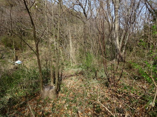 ハンノキ林の枯れコナラの薪割り、萌芽更新地区のアズマネザサ刈りなど 日時:2021/3/16(火) 10:00〜13:30 場所 生田緑地 ハンノキ林(A07)、萌芽更新地区(A06) 参加者 岩田臣生、岩田芳美 【萌芽更新地区(A06)〜湿地地区(B05)】 一昨日の里山倶楽部でも活動した萌芽更新地区で、萌芽更新株の周りの刈り残しのアズマネザサなどを刈りました。 春の進み方が速くて、オカスミレや、フッキソウも咲いていました。