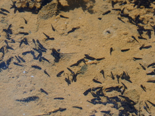 生田緑地中央地区北側の谷戸の田圃には、3/4〜5 に、アズマヒキガエルが産卵していますが、この田圃は 2005〜2006年に再生したもので、生きもののために通年湛水としています。 このため、畦は柔らかく、生きものが開けた穴からの水漏れが頻繁に起こります。 アズマヒキガエルの卵は、水が涸れたら死んでしまいますので、湛水状態を確認するために、田圃に回りました。 前日に、班員から、水漏れ補修を行ったと連絡がありましたが、田圃は湛水していて、アズマヒキガエルの卵は孵化していました。 春の陽光を受けて、数匹のキタテハが飛び回っていました。