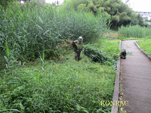 木道沿いのヨシ刈り 日時:2021/6/17(木) 10:20〜11:30 場所 生田緑地 下の田圃地区(B07) 参加者 岩田臣生 下の田圃の上側のヨシが木道まで広がっていたので、木道から 2〜3mの範囲のヨシを刈りました。 クサヨシが開花し、繁茂していました。 この辺りのオオミゾソバは、すっかり負けていました。 下の田圃の下側の水路沿いのヨシも刈りたかったのですが、雨が降り出しました。