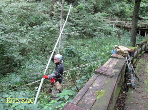 さて、両手で持ち上げようとしても持ち上がらないのに、一人の活動として丁度良いと考えたのは、ロープ・プーラーを使って、引き起こすことを考えていたからです。 ロープ・プーラーは、芝生広場上雑木林の樹木伐採を行うために、購入して、使ってきました。 今回は、ハンノキを引き起こして、その状態を保持しておいて、竹林に行って、支柱にするモウソウチクを伐り出して、運んで来て、 2 本を支柱として立ててから、ロープを外すということが、一人で、できました。