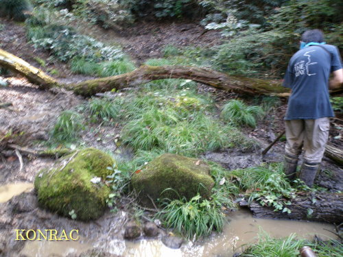 落枝を片づけてから、一番奥の崖面下に水溜まりを掘り、そこから溢れた水の流れをイメージしながら、凹みを掘って、水溜まりづくりを行いましたが、 水はなかなか溜まってはくれませんでした。