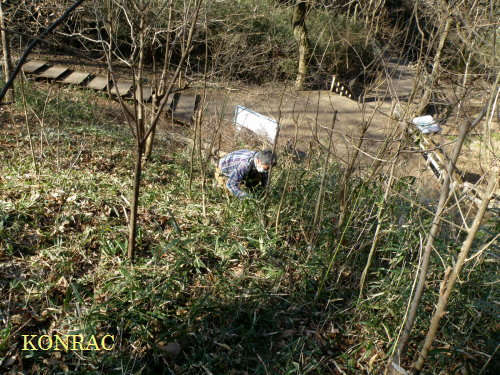 萌芽更新地区は、伝統的な萌芽更新を観察できる雑木林を目指して、1998年末に、国庫補助事業によってコナラ林 1,200u を伐採した地区です。 伐採樹の萌芽更新が失敗したことを、2008年1月の市民部会において話し合い、そこから、改めて、萌芽更新地区と呼べる樹林を目標に、里山倶楽部を軸に活動してきました。 この 14年の活動によって、目標に近づけたと感じていますので、できるだけ亭寧な仕上げをしたいと考えて、アズマネザサ刈りを行いました。 アズマネザサ刈りと言っても、刈込鋏を使い、刈った材は散らして、地面に残しました。 当該地区には、無数の実生が育って、3mを超える幼樹も少なくありません。