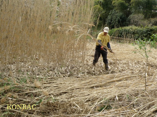 ヨシ原地区のヨシ刈り 日時:2022/3/31(木) 10:00〜13:00 晴 場所 生田緑地 ヨシ原地区(B08) 参加者 岩田臣生、岩田芳美、鈴木潤三、田村成美、上路ナオ子 春になりましたので、ヨシ原地区の枯れヨシを刈りました。 ここのヨシ刈りは、2007年1月に北部公園事務所からの相談を受けて、翌2月から活動を始めました。 最初は、ヨシの上に、フジ、カラスウリ、カナムグラなどが覆い被さり、凄い状態でした。 その時に、水位が高いことが分かったので、穴を掘って、池をつくってみました。 その池は泥が溜まっていましたが、シュレーゲルアオガエルが軽快に鳴いていました。 少し泥上げをしてあげないと可哀そうでしょう。 カサスゲの葉が伸びていました。 3週間もすれば、雄花が黄色い花粉を輝かせて、存在を主張するでしょう。 残念なことに、キショウブも発芽し始めていました。 冬季は、シジュウカラや、アオジなどが茂みの中にいることが観察されるので、ヨシ刈りは春になってからの活動にしています。 枯れヨシ刈りは斜め伐りになることが多いため、前年の伐り株を踏み抜いてしまう事故が起こり易く、この日も新人一人が踏み抜いてしまいました。 こうした事故はアズマネザサでも起こり、私たちの活動ではよくあるため、踏み抜き防止板の入った安全長靴がお薦めです。 ヨシ刈りだけであれば、面倒でも、刈ったヨシを置いて、歩ける場所を道状につくりながらヨシを刈るようにして、その道以外には降りないようにしていますが、 皆さん自分で考えて工夫しています。