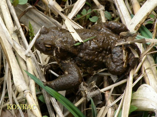 枯れヨシを刈っていたら、足元からアズマヒキガエルが出てきました。