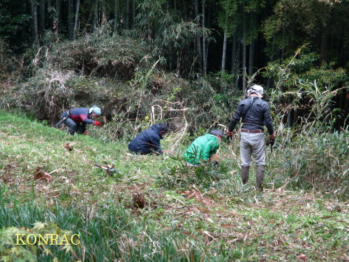湿地地区のヒメコウゾ、アズマネザサ、オギなどの茂み刈り、水辺保全など 日時:2022/4/14(木) 10:00〜12:30 小雨 場所 生田緑地 湿地地区(B05) 参加者 岩田臣生、岩田芳美、田村成美、伊澤高行、井口 実 前日からのテレビの天気予報は広い範囲で雨でしたので、活動は休むつもりでいたのですが、朝の宮前区では降っていなかったため起こされて、 迷いましたが、出てきている人がいるかも知れないと思い、兎も角、生田緑地には向かうことにしました。 到着して様子をみていたら、3人が集まりましたので、活動を始めました。 湿地地区3段目 谷戸の湿地地区の3段目の下は別の団体が畑を耕作しているので、緩衝帯として、ヒメコウゾや、オギや、アズマネザサなどを自由に繁茂させていますが、春になったら全面的に刈ることにしています。 茂みを大きくしてしまうと、湿地3段目の水辺が暗くなると思われるためです。 毎春刈っているのに、衰退することなく、2m以上の高さに繁茂します。 この茂みについては、上を覆うカナムグラを見逃してやって、アオジなどの野鳥のために、実をつけさせてあげてもいいだろうと、私は思っていますが、・・・。