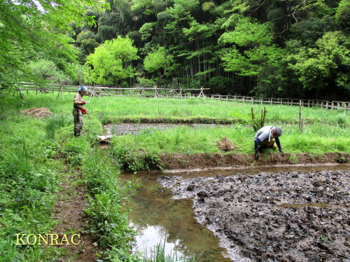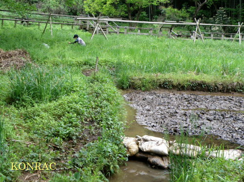 上の田圃地区 上の田圃の堰の土嚢が落ちていて、湛水していなかったので、土嚢を 2袋追加して、この土嚢が大雨で流されないように、竹串を突き刺しておくことにしました。 併せて、畦からの水漏れを止めるために、穴をチェックして、イネワラ補修を行いました。 今回は、シュレーゲルアオガエルの卵塊を見つけました。今年 3個目でした。 田圃下草地の池の水漏れも補修しました。 導水路部の泥上げも行いました。