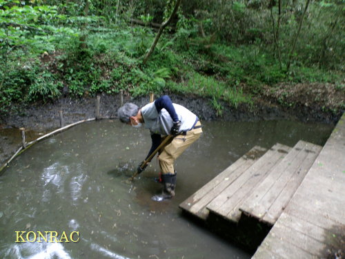ハンノキ林上の池 この日の、もう一つの目的は、ハンノキ林上の池の泥上げです。 池のデッキの上から、肥柄杓を使って、泥上げを行いました。 ここは、少しずつ、多頻度で行うのが良いと考えています。