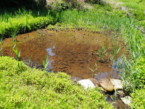 下の田圃の状態も観察しました。 水中で戯れるホトケドジョウが見えました。 ここの土嚢堰も補修して、田圃の中に生えてきたヨシは根から掘り取っておいた方が良さそうです。 田圃の周囲は、ミゾソバが優占してしまいました。