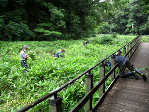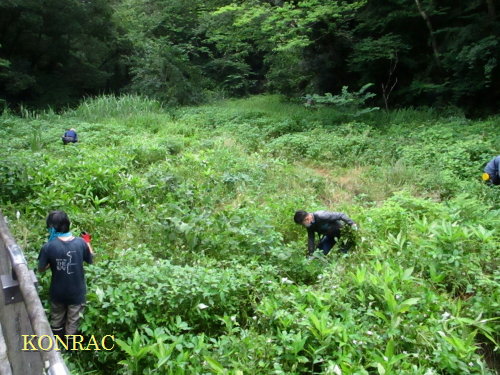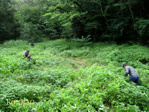 (上の田圃下草地) 活動(鈴木潤三、田村成美、伊澤高行、上路ナオ子、井口 実) 田圃下草地のカナムグラ抜きを行いました。 これは、ノカンゾウ、ツリフネソウ、ミゾソバなどの保護のためです。