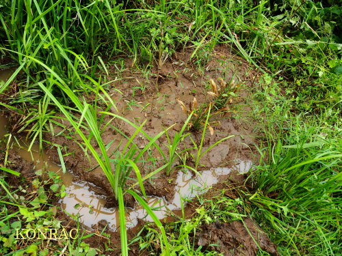 田圃下草地の池につながる水路には大きな水漏れ穴がありました。 最近の暑さの中の保全活動は辛いので、暫くは涸れた状態でもよしとしていました。 今回は、補修を試み、池を湛水させました。