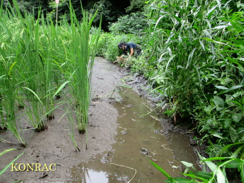 見回せば、田圃下草地は、すっかりカナムグラに覆われていました。 この時期のカナムグラ刈りは、カナムグラの茎を見つけて、常時持ち歩いている桑切鎌で切るようにしています。 ツルを引っ張ってしまうと、カナムグラが絡みついているツリフネソウが折れたり、倒れたりしてしまいます。 ノカンゾウの花期が終わったら、ツリフネソウやミゾソバの花を楽しめるようにするための植生管理を行っています。
