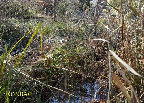 (ヨシ原の池) 水環境調査のために、毎月通っていた頃は、容易に池まで行けましたが、この日は、どこを歩けば良いのか分からない状態でした。 そういえば、秋の泥上げも行っていませんでした。 しかし、水は流入していて、池には水面がありました。 その池の末端部の畦の下からは水が浸み出していて、土が柔らかくなっていますので、一応、踏み固めました。 ここのヨシの茂みには、野鳥はいませんでした。