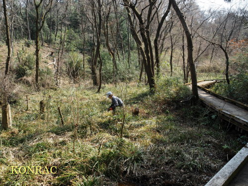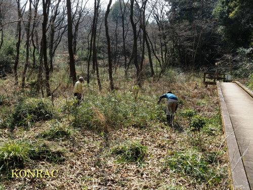 ハンノキ林のアズマネザサ刈り 日時:2023/3/9(木) 9:00〜12:00 晴 場所 生田緑地 ハンノキ林地区(A07-01) 参加者 岩田臣生、上路ナオ子、鈴木潤三、田村成美、冨田健斗 谷戸へ降りる園路では、ヒヨドリ、キジバトなどの群れに会いました。 日差しは、すっかり春になっていましたので、毎年の活動である、ハンノキ林の林床のアズマネザサ刈りを行いました。 ハンノキ林南端部(A07-01)については、行政によるコナラ枯損木伐採によって傷めつけられた箇所を確認しながら、開花直前のモミジイチゴの林の枯木の除去とアズマネザサ刈りを行いました。 その結果、行政によるコナラ枯損木伐採は、伐採材運搬のために車両状の機械を当該林地に入れて、強引に道をつくって、伐採材を運搬したらしいと分かりました。 邪魔な枝は折って、それでも邪魔なら伐採して、ハンノキ幼木のために立てた支柱は踏み潰して、水路には伐採材を詰めて、その車両状の機械を走らせて、材を運搬するという乱暴極まりないことを したらしいと推測しています。 池の脇のハンノキについては、折れたので、伐ったという説明を聞きましたが、 問題は、何故、折れたのかということで、今回、調べてみて、それなりの幅員のある機械を使って、作業したのだろうと考えることで理解できました。 生田緑地では、自然保全のために、園路・広場以外は立入禁止にしていたはずです。 どうしても立ち入る必要がある時は、その行為について、自然環境保全管理会議(通称、自然会議)の承認を得なければならないはずだったと思います。 調査については、そのような手続きを踏んでいたと思います。 それは、枯損木伐採についても、同様でなければなりません。 自然会議の会員であるばかりでなく、事務局でもある生田緑地整備事務所は、当然理解していることであり、 実際には、業者に発注して行うとしても、このことを遵守しなければならないはずです。 自然会議の事務局としては、当然、何のために、そのような取り決めを行っているのかは承知しているはずなので、 業者に施工させる場合には、事前に、当該業者に対して、必要な説明を行っていなければならないと思います。 また、実際の施工が適切かどうかを把握しているべきだと思います。 ハンノキ林地区については、調査団水田ビオトープ班では、2006年末から、樹木調査を始めて、棲息している生物が今後も生き続けられるように、その棲息環境を保全する活動を行ってきました。 活動は、観察した生物や水の状態などを調べて、植物一本一本を管理するような細かい作業を、少しずつ、繰り返し実施することを継続してきました。 現地を調べないで、枯損木を伐採して、運べば、それだけで良し、植物や水辺がどうなろうと問題ないとする行為は許せません。 材の置き場所については、当初、全てを生田緑地外に運び出すことが条件だと聞いたので、そのコストは馬鹿にならないと思い、提供した場所です。 まさか、伐採材を置くために、ハンノキを伐採してしまうとは思いもしませんでした。 一昨日(3/7)に、水路を埋めていた土などを取り出して、水が流れるようにしておきましたので、乾いていた林床の水溜まりに、僅かながら水を確認できました。