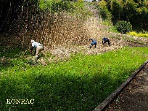 上の田圃の水漏れ補修、下の田圃のヨシ刈り 日時:2023/4/6(木) 10:00〜12:00 曇後晴 場所 生田緑地 上の田圃、下の田圃 参加者 岩田臣生、井口 実、上路ナオ子、鈴木潤三、田村成美 朝、倉庫前に置いているプランターを見たら、小さなユリ?が、いくつも生えていました。 昨年は、一枚葉が出ていただけでしたが、今年は、一枚葉も出ていますが、小さなユリの形をしたものが、いくつもありました。 これは、ヤマユリの種子を採取して、播種して、育てているヤマユリですが、発芽させることはできました。 後は、雑木林などに移植して、開花するまでの4〜5年の植生管理に挑戦しようと思います。 いつもながら、この辺の活動になると、庭園管理ではないか、自然保全なのかという疑問を持ってしまいますが、 移植した中の 10%でも開花すれば良いと考えることで、都市公園の自然保全活動として納得するようにしています。