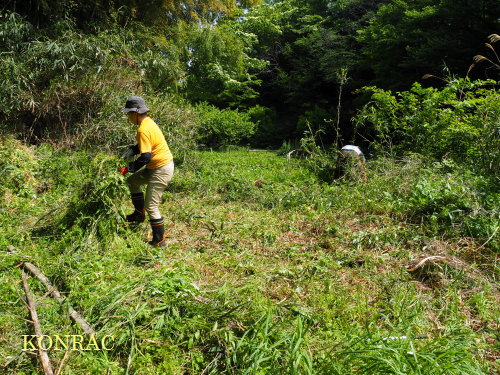 @湿地地区のヒメコウゾ・オギ・アズマネザサ刈り A水辺保全 日時:2023/4/20(木) 9:00〜12:00 晴 場所 生田緑地 湿地地区(B05)3段目 参加者 A9:00〜 岩田臣生 @10:00〜 上路ナオ子、鈴木潤三、田村成美、冨田健斗 ハンショウヅルが咲き始めました。