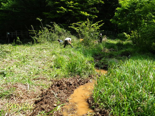 一昨日の湿地地区の活動で、3段目まで、水が届くようにしたつもりでしたが、2段目の水路の途中に穴が開いていて、そこで水が消えていました。 そこで、この水漏れ穴を塞いで、その上に、ミヤマシラスゲを一株移植しました。 水が3段目に落ちるのを確認し、そこの泥上げを行いました。 改めて、3段目の状態を観察しましたが、水面があるべき場所が、殆んど、水涸れで、水辺と言える状態ではありませんでした。 そこで、先ずは、昨年まで、保護対象植物が生えていた辺りに、水溜まりをつくることにして、泥上げを始めました。 土質は粘土質が多く、水を溜めるのには良いだろうと思われるものの、スコップで掘るのは容易ではありませんでした。 2段目から落ちてきた水を受ける水路を繋いでおいて、その先の蛇行する水路痕の泥上げを進め、水溜まりをつくるための小さな堰をいくつもつくりました。 それから、最初に掘った水溜まりに戻りましたが、まだ水が溢れる状態にはなっていませんでした。 辺りの状態を改めて観察すると、陽当たりの良い場所が広がっていました。 そこで、最初に掘った水溜まりを上側に広げて、水路にもつなげることにしました。 この水溜まりを拡大する作業が終わるころには、この水溜まりから下流にも水面が広がり始めていました。
