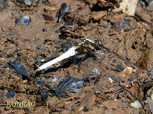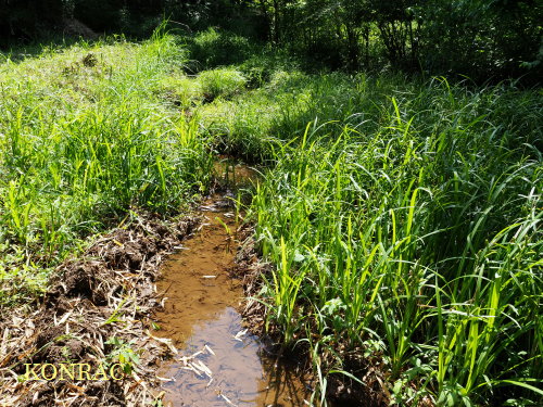 数匹のヤマサナエに出会えて、状態確認もできたので、他の水辺を見に行くことにしました。 (上の田圃) 上の田圃は、降雨によるものか、カルガモによるものか、分かりませんが、水面の上に頭を出している土の部分が広がったように思いました。 再度、水漏れ穴を調べる必要がありそうですが、今回は、取り敢えず、普段は溝にしている畦沿いを土で埋める、つまり畦に土を寄せておくことにしました。